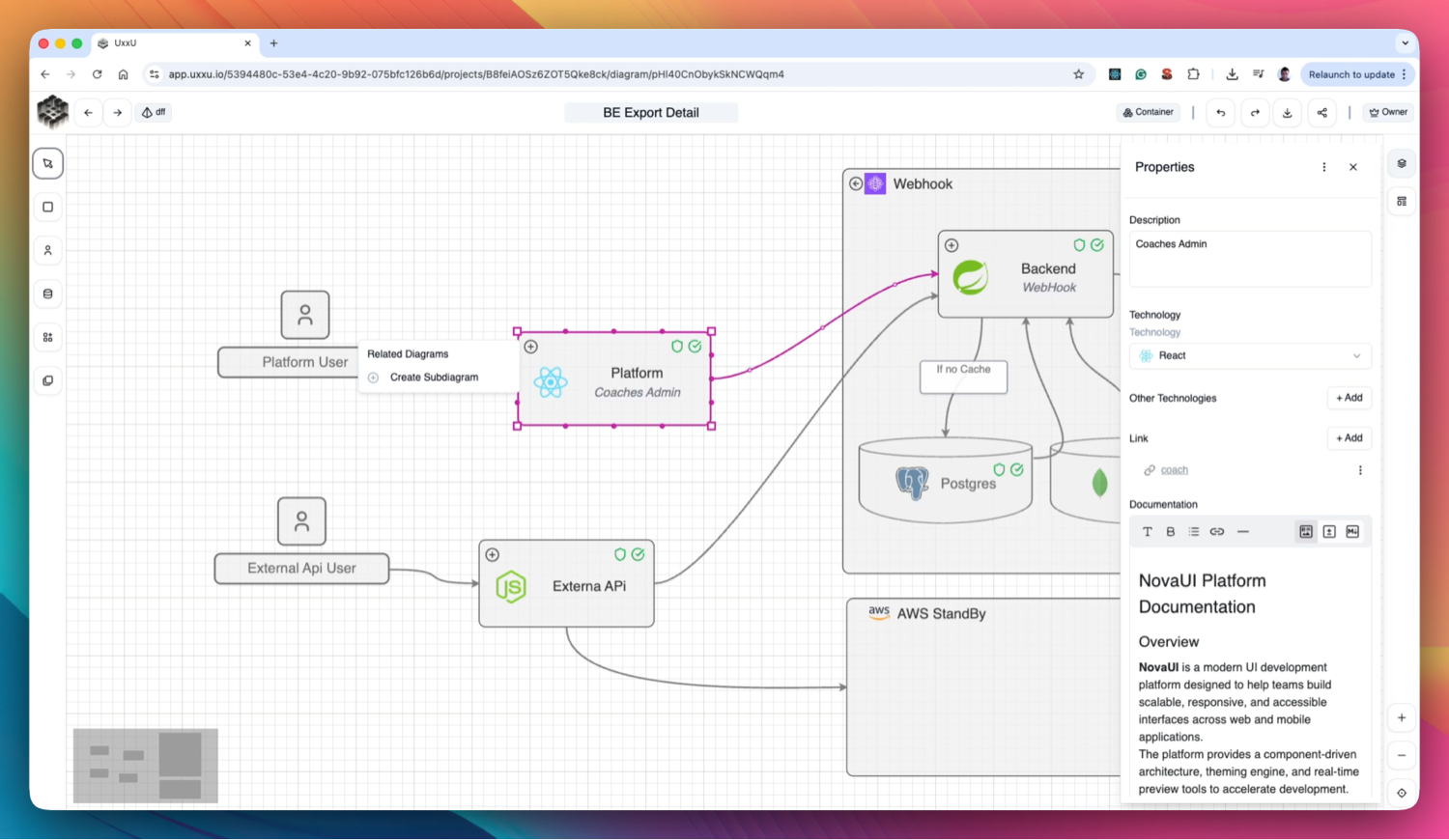 Uxxu transforms architecture diagrams into a **connected architecture map**. Instead of isolated diagrams, every view is linked to the architecture elements it represents. This allows teams to explore complex systems naturally, moving from high-level overviews to deeper technical details while always maintaining context.